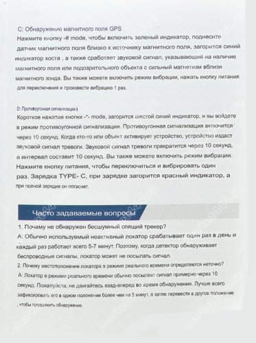 | Режимы работы, поиска | 1) Электромагнитному излучению. 2) Магнитному полю. 3) Визуальный поиск скрытых микро видеокамер при ИК. 4) Фонарик. 5) Противоугонная сигнализация. |